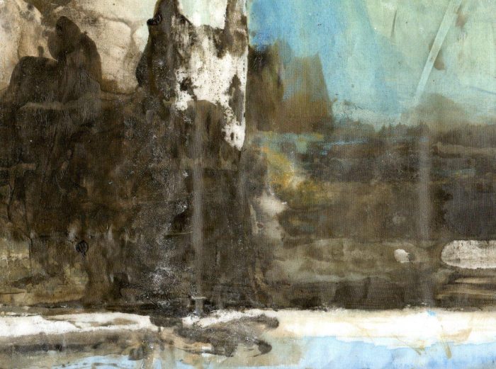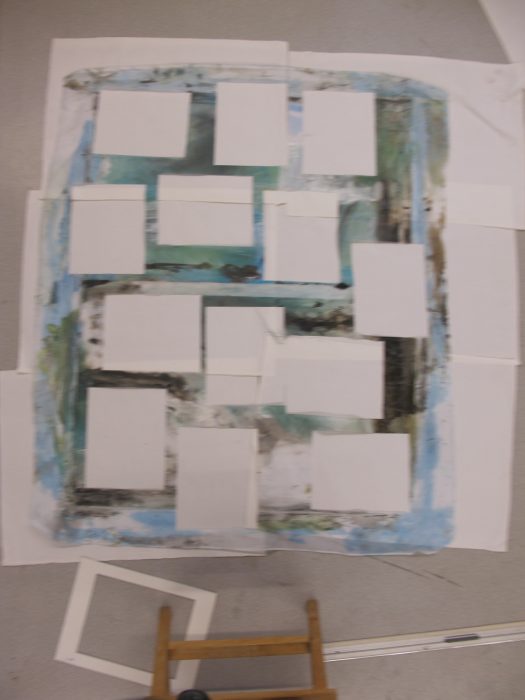 Série de 13 espaces (22×27 cm) extraits d’un organdi (pigments et acrylique sur organdi, 146×121 cm) réalisée avec la participation de Patrice Loraux, en février 2012 selon le protocole suivant :