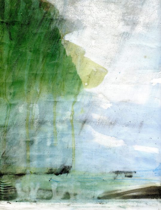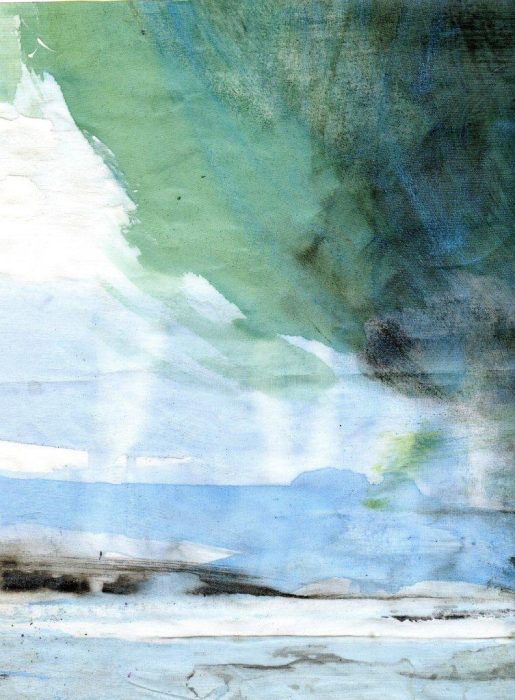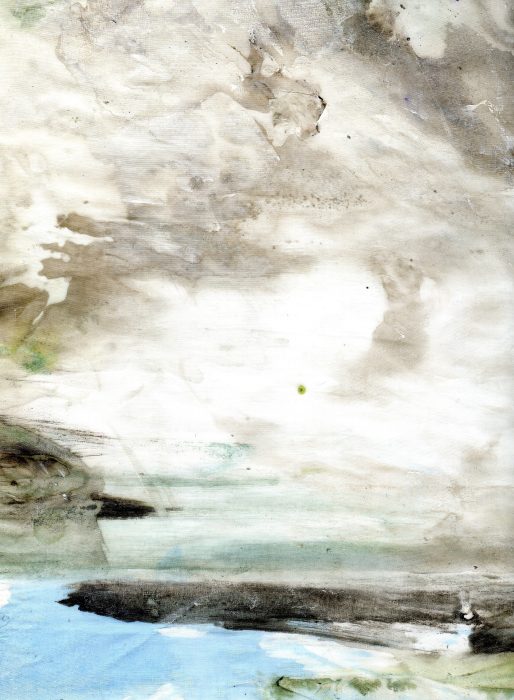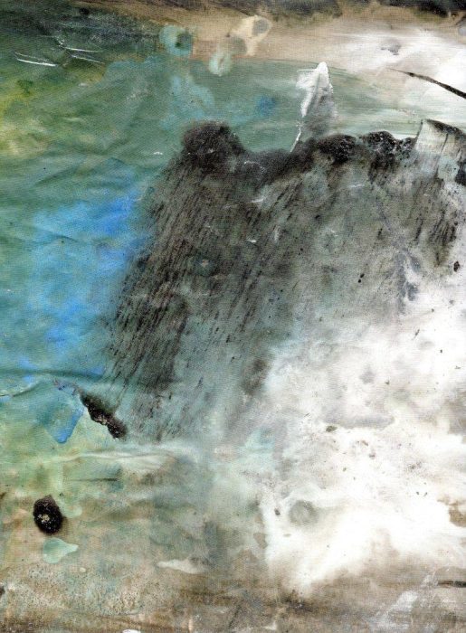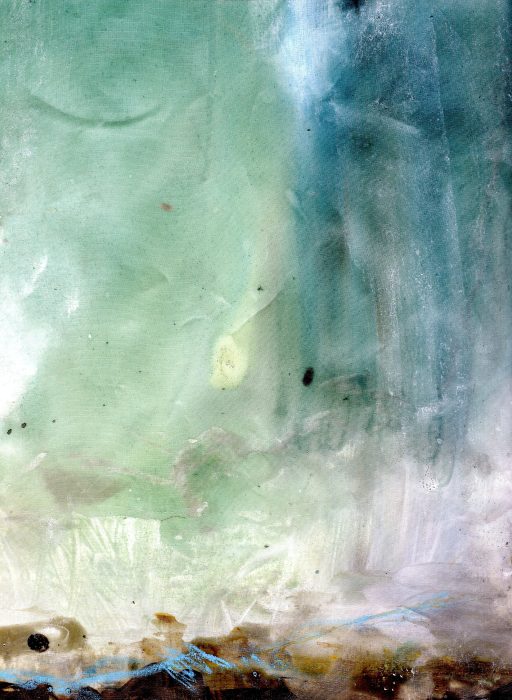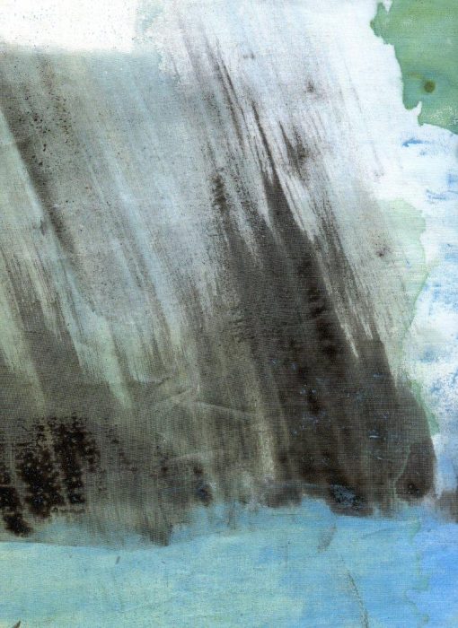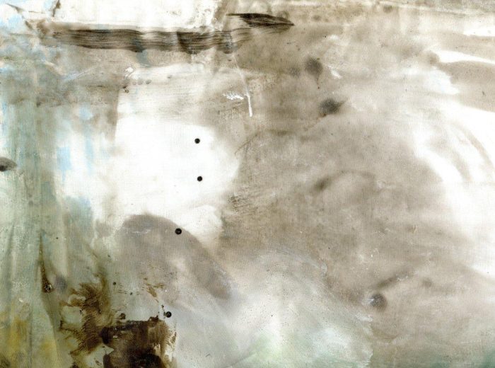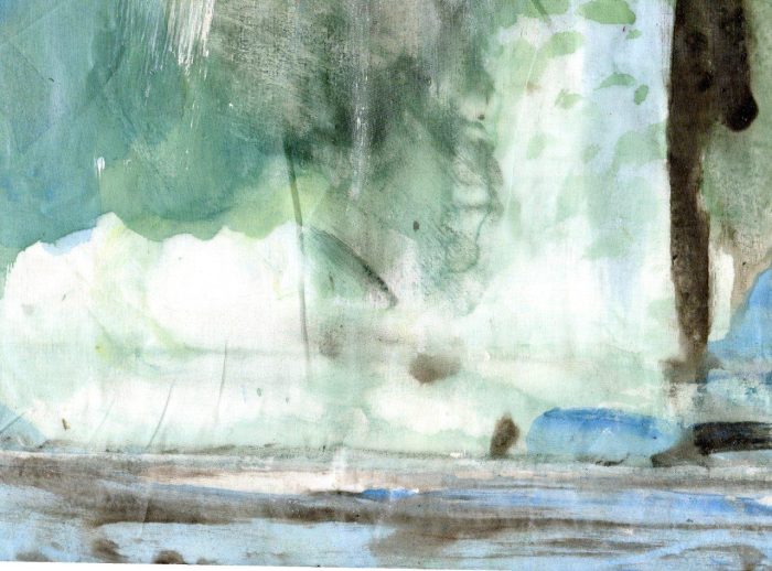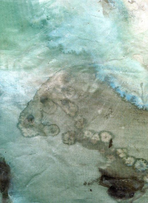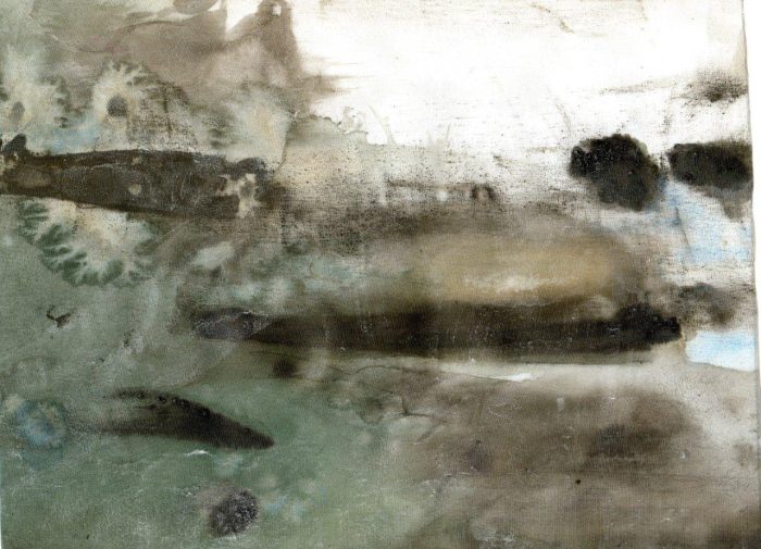 1/ Je soumets à Patrice un organdi que j’ai peint – et renouveler, cette fois-ci pour lui exclusivement, une expérience que j’avais proposée d’oeuvre participative lors d’une exposition H1Nart au Carré Baudouin (nov. 2009) et qui l’avait beaucoup intéressé